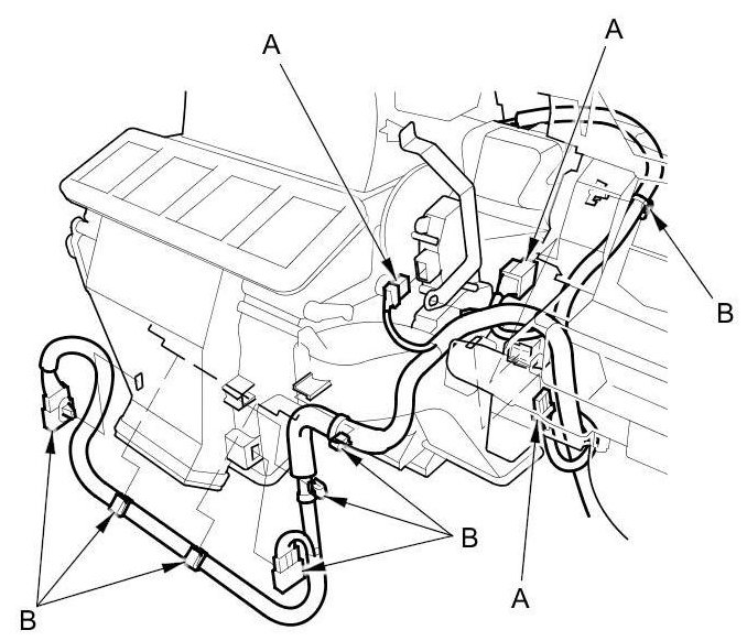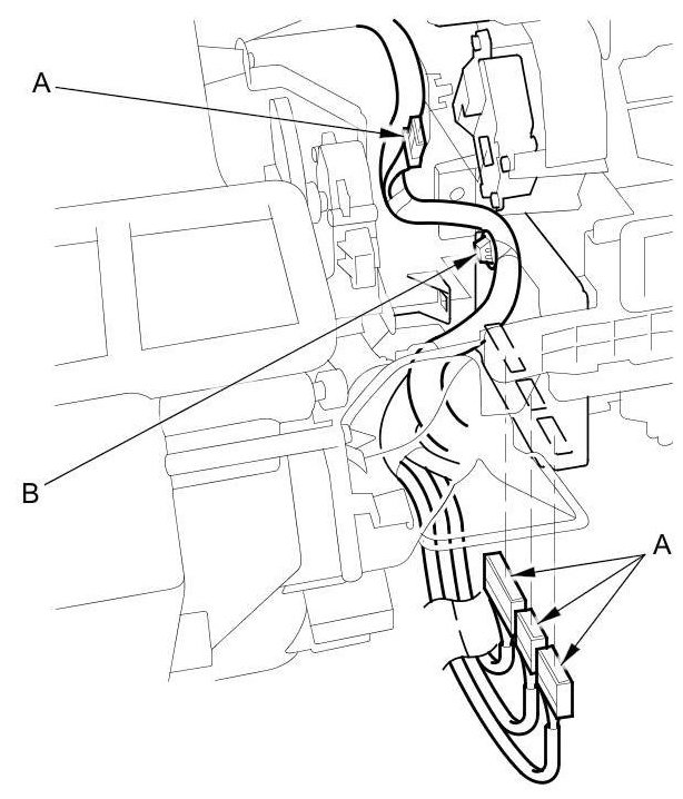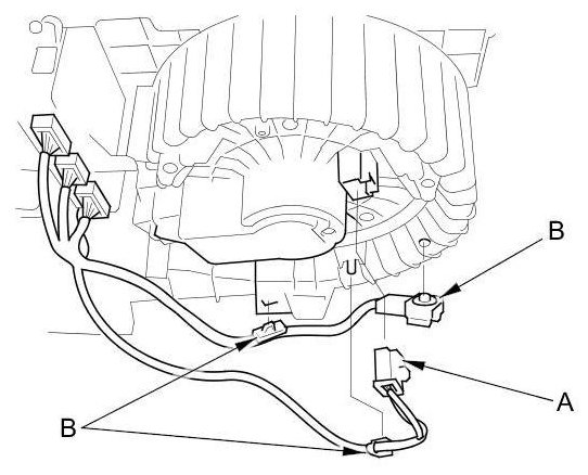 9. Disconnect the connector (A) from the blower motor. Detach the harness clips (B).