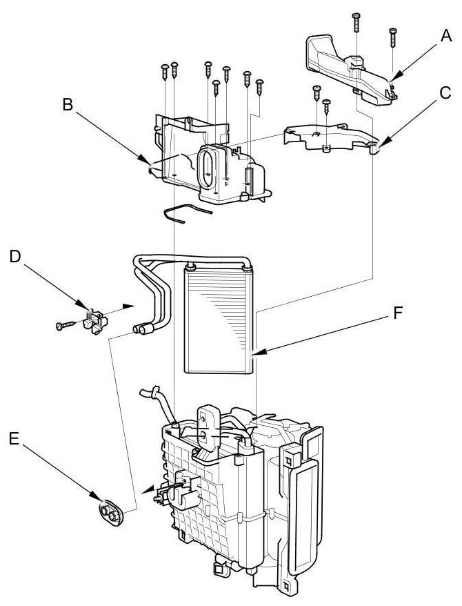 13. Remove the self-tapping screws and the passenger's heater duct (A). Remove the self-tapping screws and the joint duct (B). Remove the self-tapping screw and the heater core cover (C). Remove the self-tapping screw, the heater pipe bracket (D), and the grommet (E), and carefully pull out the heater core (F).