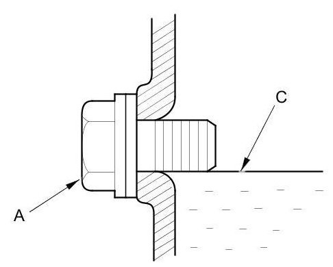 10. After the fluid stops overflowing, install the fluid check bolt (B) with a new sealing washer (C).