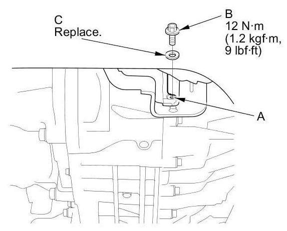 3. Remove the fluid check bolt (A) and the sealing washer (B). Check the condition of the MTF and make sure it is at the proper level (C).