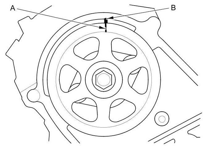 22. Turn the crankshaft pulley so its white mark (A) lines up with the pointer (B).