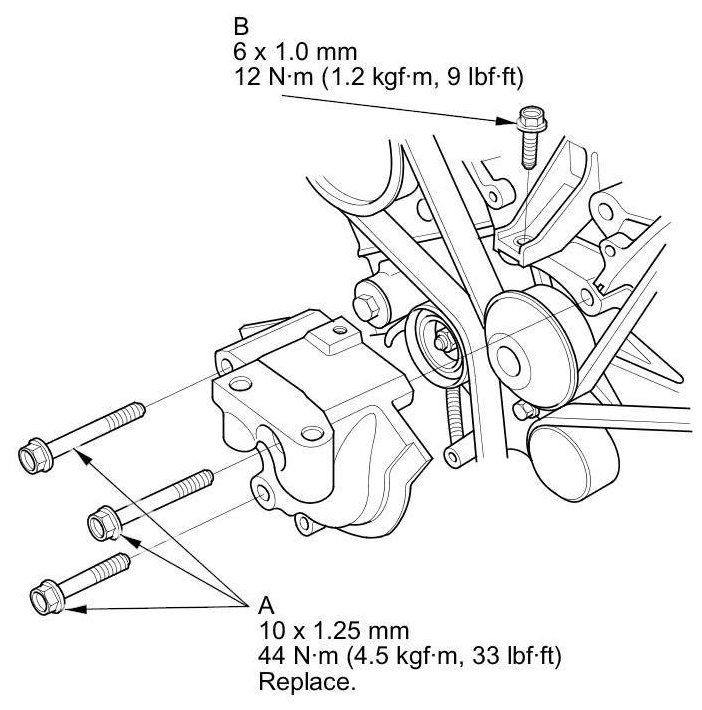 16. Install the lower half of the side engine mount bracket using new bolts (A) and the bolt (B).