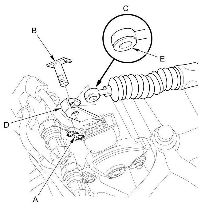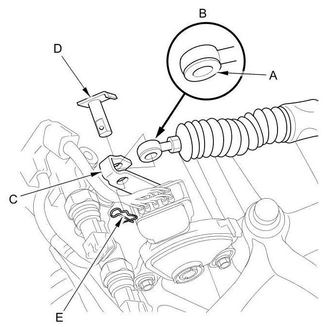14. Attach the shift cable end to the control lever (C), then insert the control pin (D) into the control lever hole through the shift cable end, and secure the control pin with the spring clip (E).