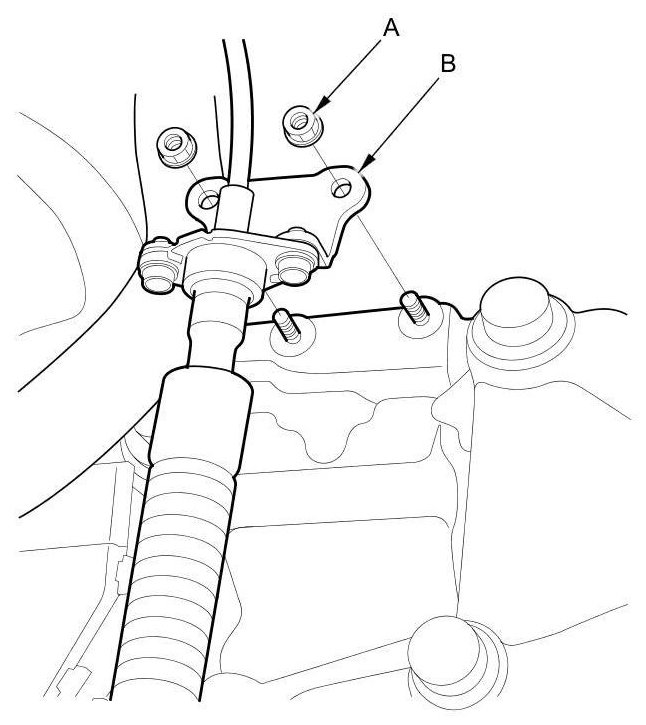5. Remove the nuts (A) securing the shift cable bracket (B).