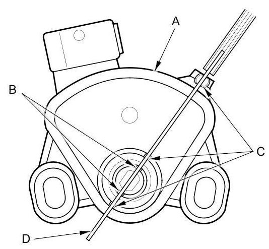 2. Remove the spring clip (A) and the control pin (B), then separate the shift cable end (C) from the control lever (D).