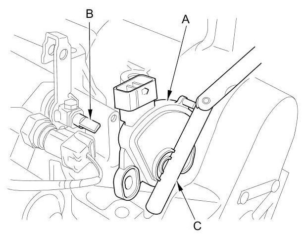8. Set a new transmission range switch (A) to the N position. Align the cutouts (B) on the rotary-frame with the neutral positioning cutouts (C) on the transmission range switch, then put a 2.0 mm (0.079 in) feeler gauge blade (D) in the cutouts to hold the transmission range switch in the N position.