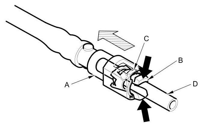 4. Place a rag or a shop towel over the quick-connect fitting. Hold the connector (A) with one hand, and squeeze the retainer tabs (B) with the other hand to release them from the locking tabs (C). Pull the connector off.