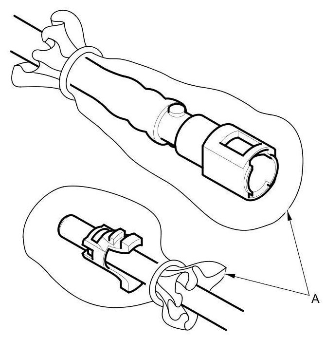 6. To prevent damage and keep foreign matter out, cover the disconnected connector and line ends with plastic bags (A).