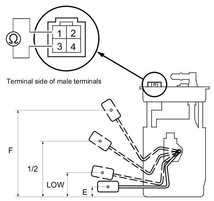 10. Measure the resistance between fuel tank unit 4P connector terminals No. 1 and No. 3 with the float at E (EMPTY), LOW (LOW FUEL INDICATOR), 1/2 (HALF FULL), and F (FULL) positions.