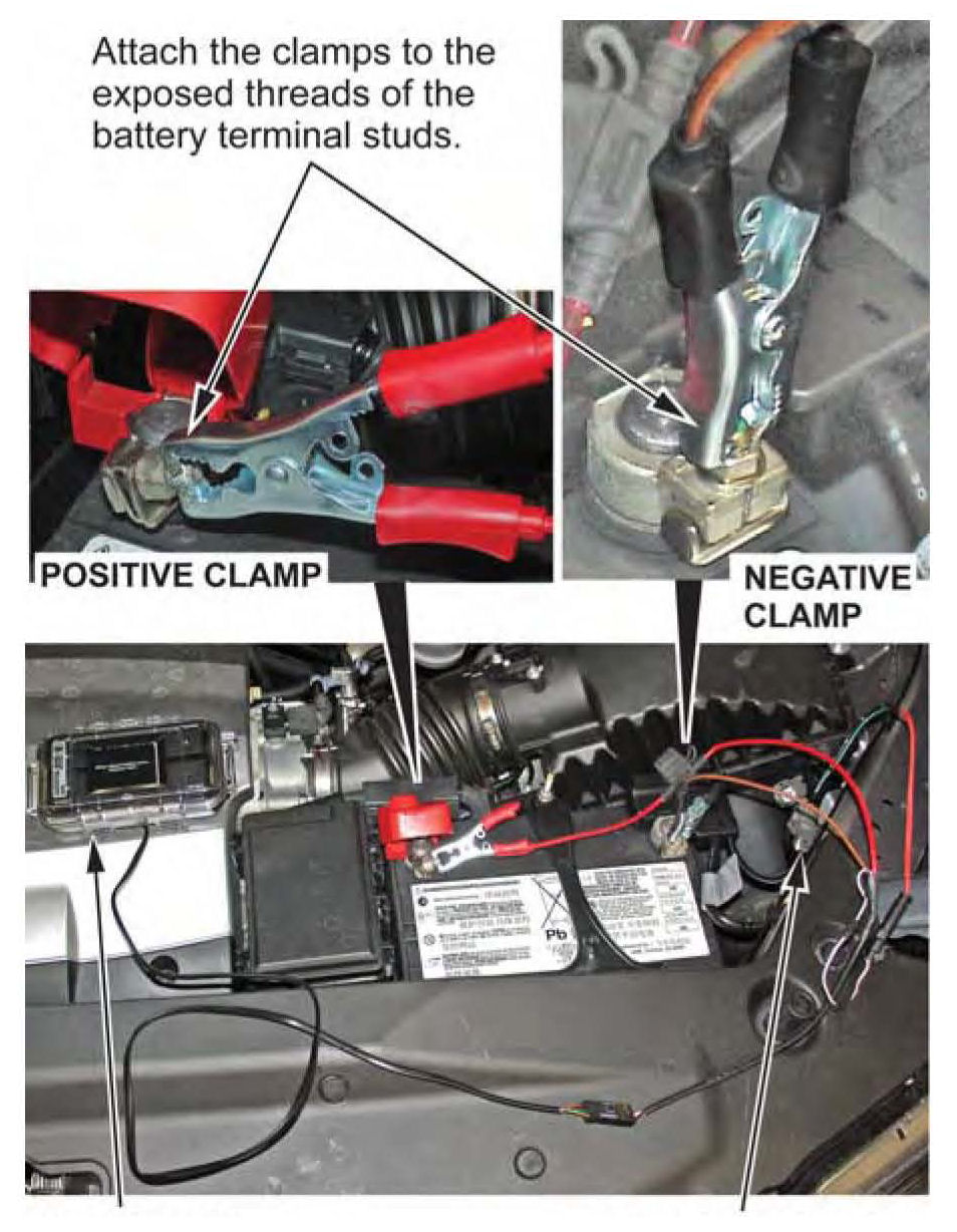 Make sure the clamps are securely on the battery studs. If the clamps slip off while updating the software, the battery sensor will be damaged.