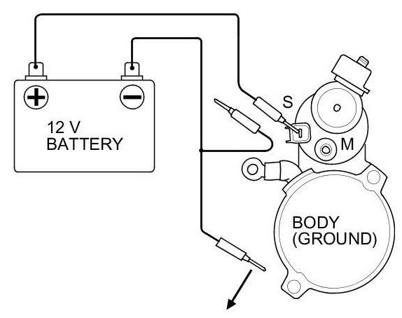 6. Connect the battery as shown. Make sure you disconnect the starter motor wire from the M terminal. If the starter pinion moves out, it is working properly.