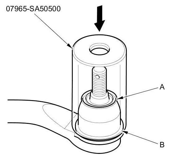 6. Install the ball joint boot (A) using the bearing driver attachment. The boot must not have a gap at the boot installation sections (B). After installing the boot, check the ball pin tapered section for grease contamination, and wipe it if necessary.