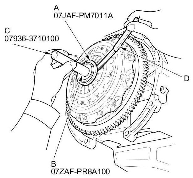 2. Check the evenness of the height of the diaphragm spring fingers using the clutch alignment disc (A), the clutch alignment shaft (B), the remover handle (C), and a feeler gauge (D). If the height difference is more than the service limit, replace the pressure plate.