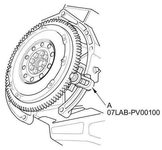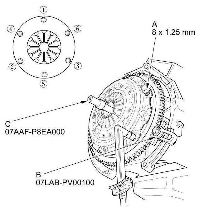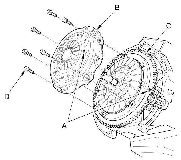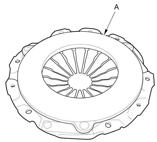 27. Torque the pressure plate mounting bolts (A) in a crisscross pattern. Tighten the bolts in several steps to prevent warping the diaphragm spring. Make sure that there is no clearance between the pressure plate and the flywheel.