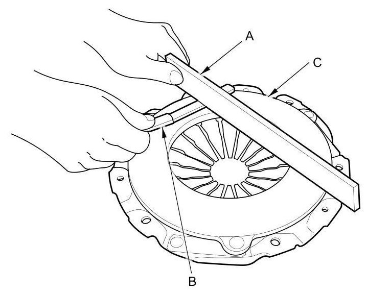 7. Inspect for warpage using a straight edge (A) and a feeler gauge (B). Measure across the pressure plate (C). If the most measurement difference is more than the service limit, replace the pressure plate.