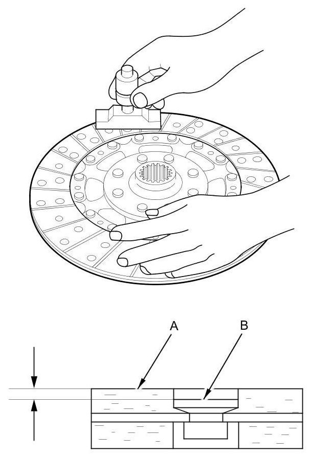 11. Measure the depths of the rivets from the clutch disc lining surface (A) to the rivets (B) on both sides. If the measurement is less than the service limit, replace the clutch disc.