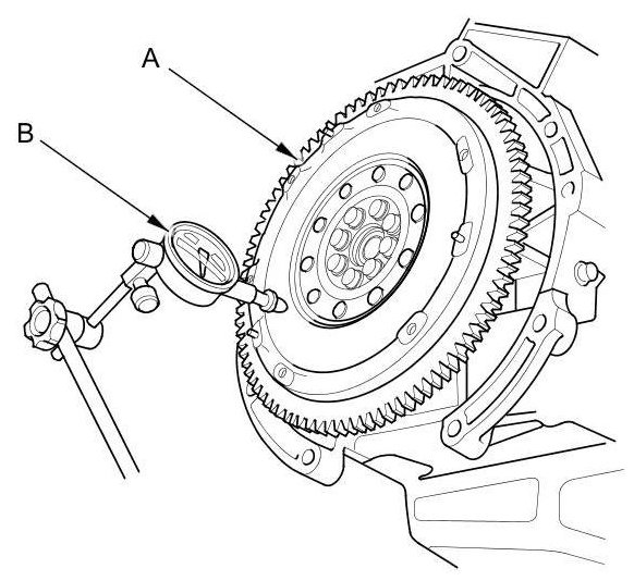 15. Measure the flywheel (A) runout using a dial indicator (B). Through at least two full turns with pushing against the flywheel each time you turn it to take up the crankshaft thrust washer clearance. If the measurement is not within the standard, replace the flywheel, and recheck the runout; go to step 16.