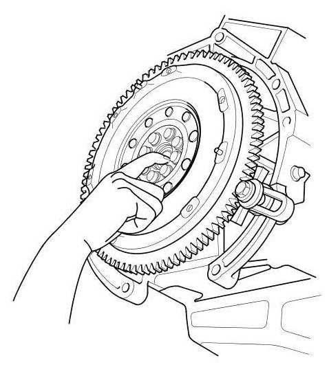 17. Loosen the flywheel mounting bolts in a crisscross pattern in several steps. Remove the bolts, then remove the flywheel and the ring gear holder.