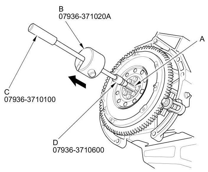 21. Remove the pilot bearing (A) using the slide hammer (B), the remover handle (C), and the 20 mm bearing remover shaft set (D).