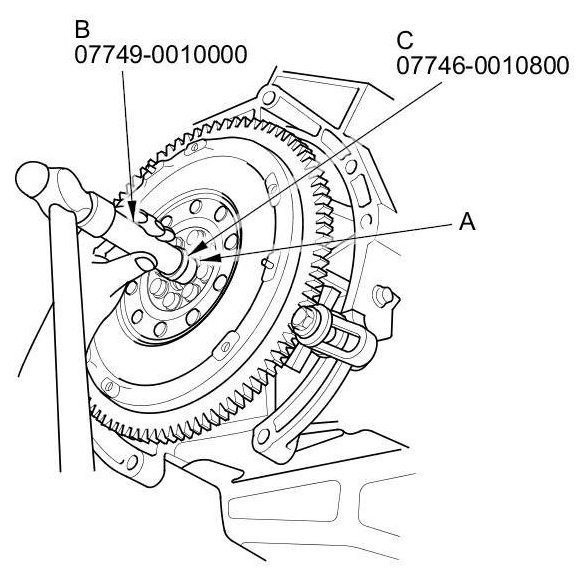 22. Install a new pilot bearing (A) into the flywheel using the 15 x 135L driver handle (B) and the 22 x 24 mm bearing driver attachment (C).