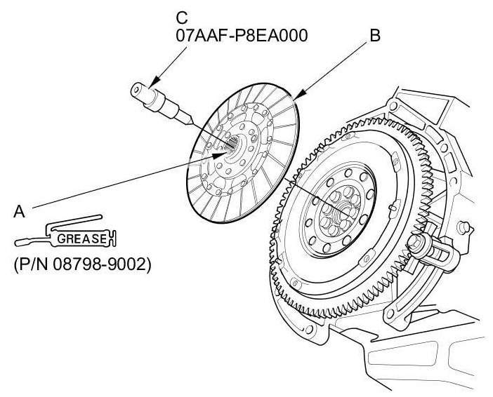 24. Apply super high temp urea grease (P/N 08798- 9002) to the splines (A) of the clutch disc (B), then install the clutch disc using the clutch alignment shaft (C).