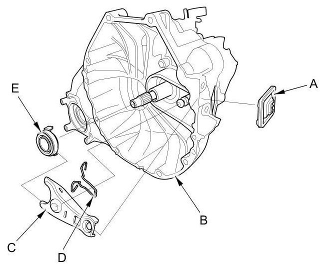 3. Remove the release fork (C) from the clutch housing by squeezing the release fork set spring (D). Remove the release bearing (E).