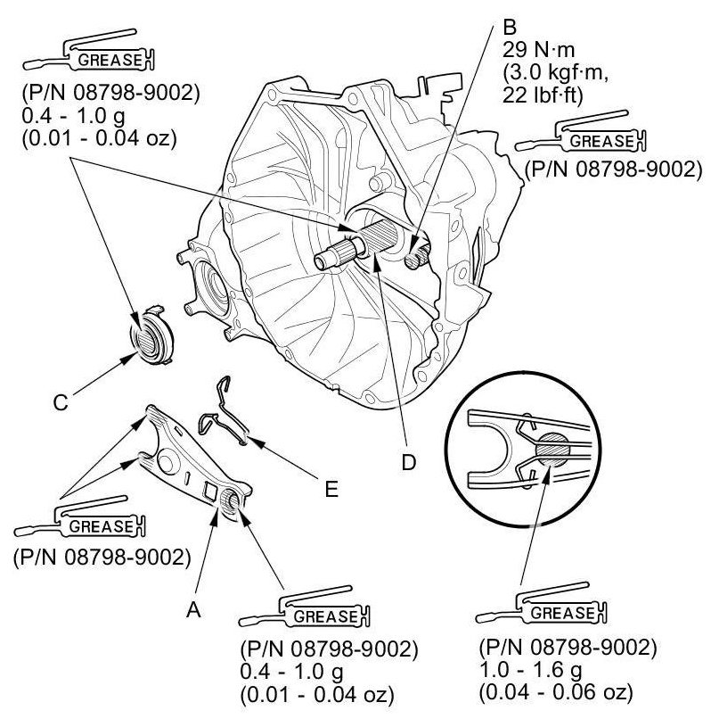 5. Apply super high temp urea grease (P/N 08798-9002) to the release fork (A), the release fork bolt (B), the release bearing (C), and the release bearing guide (D) in the shaded areas, then set the release fork set spring (E).