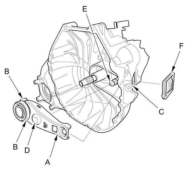 8. Install the release fork boot (F). Make sure the boot seals around the release fork and the clutch housing.