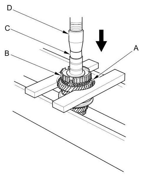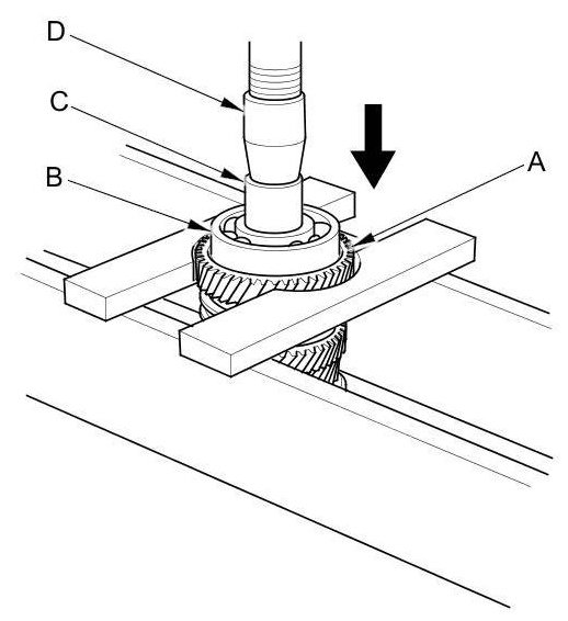 1. Support 6th gear (A) on steel blocks, and press the mainshaft out of the angular ball bearing (B) and 6th gear using an attachment (C) and a press (D).