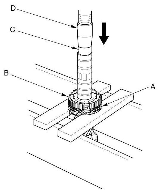 3. Support 3rd gear (A) on steel blocks, and press the mainshaft out of the 3rd/4th synchro hub (B) and 3rd gear using an attachment (C) and a press (D).