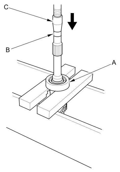 4. Support the angular ball bearing (A) on steel blocks, and press out the mainshaft using an attachment (B) and a press (C).