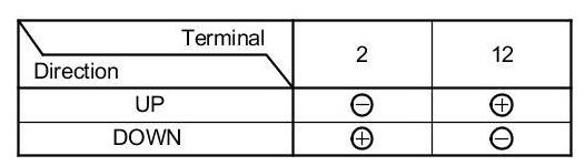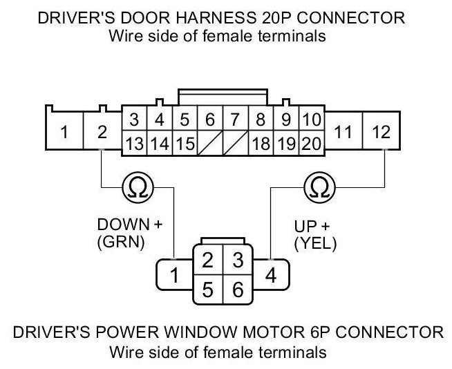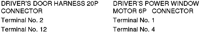 2. At the driver's door wire harness 20P connector, test the power window motor in each direction by connecting battery power and ground according to the table. When the motor stops running, disconnect one lead immediately.