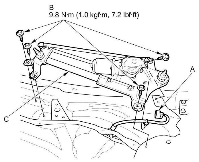 4. Remove the four bolts (B) and the wiper linkage assembly (C).