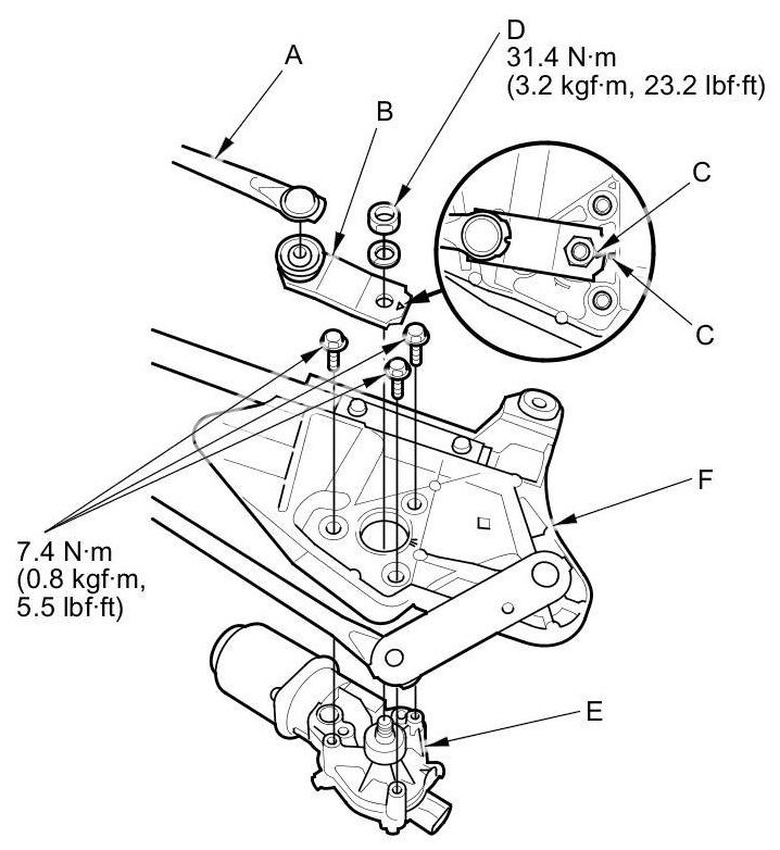 7. Remove the three bolts, and separate the wiper motor from the linkage (F).