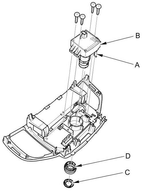 3. Disconnect the interface dial connector (A). Remove the screws and interface dial (B). Carefully pry off the knob (C) with a small screwdriver, then apply slow and steady pressure with your thumbs to push out the interface dial until the dial (D) pops off.