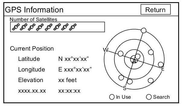 By pressing and holding the MENU button for 2 seconds, a GPS Detail screen appears. This screen displays real time incoming satellite positional data when the vehicle is outside in the open. The information shown on this screen is for factory use.