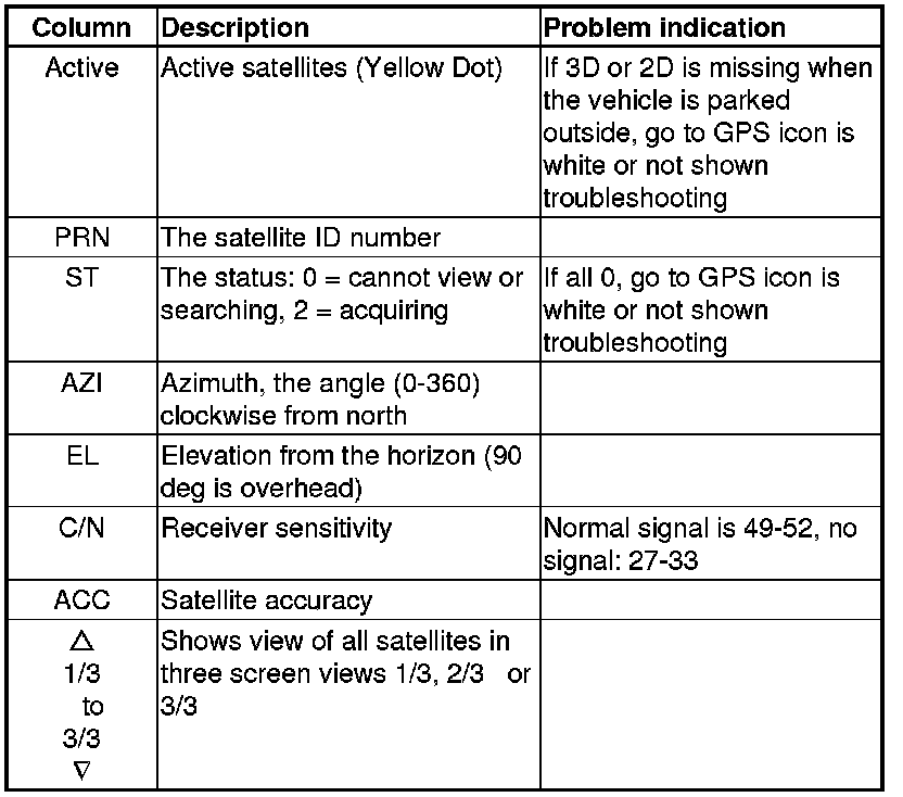 - If the row of data in the table below begins with a yellow dot, the AZI and EL fields can be used to locate each satellite on the circular GPS diagram (see prior screen).