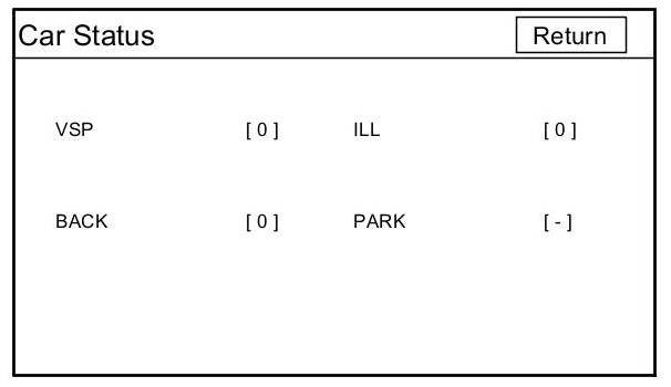 Use this screen to confirm that the audio-navigation unit is properly receiving input signals. Signals equal to (0) are OFF, and signals equal to (1) are ON. If the value on the display does not match the actual vehicle status, then check the wire carrying the signal.