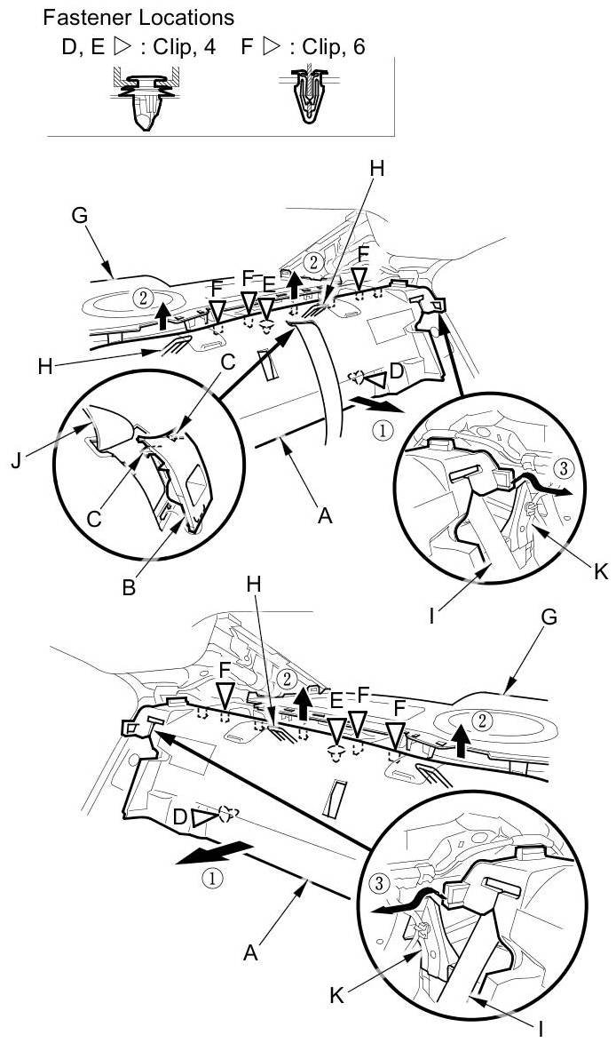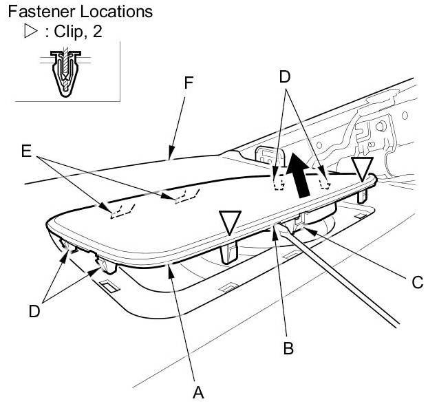 3. Pull up the cover to detach the clips (E) fastening it to the body, and the clips (F) fastening it to the rear shelf (G).
