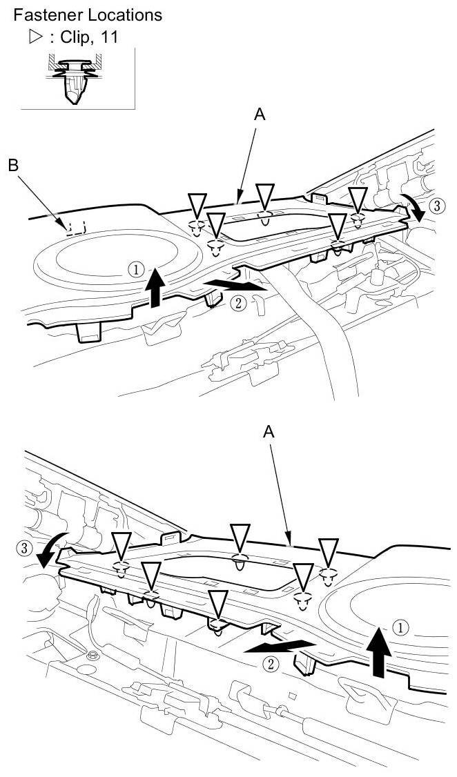 1. Pry up at the notch (B) with a flat-tip screwdriver, of the grille to release the hook (C).