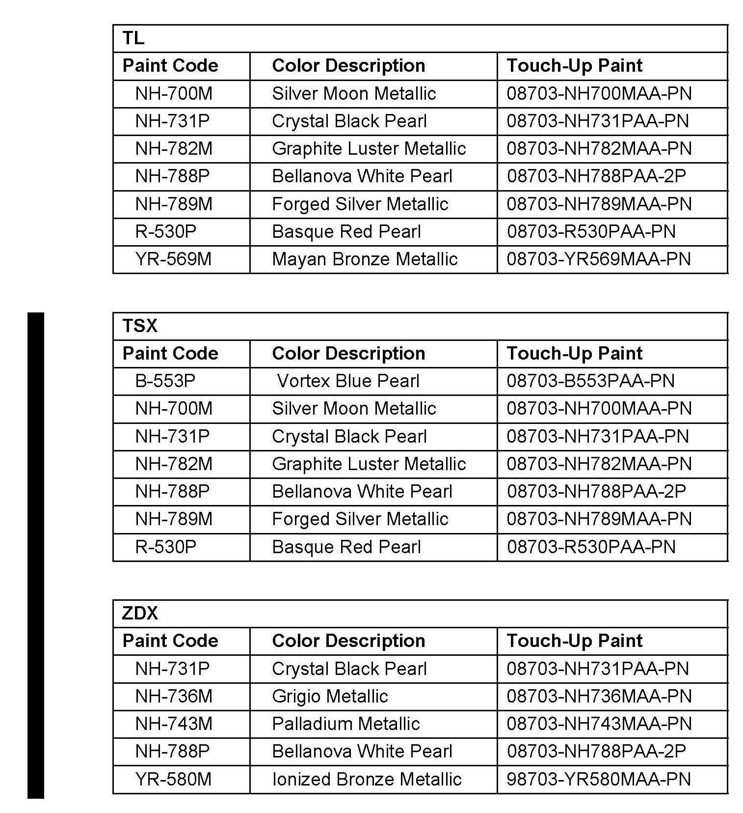 2012 Acura Paint Codes