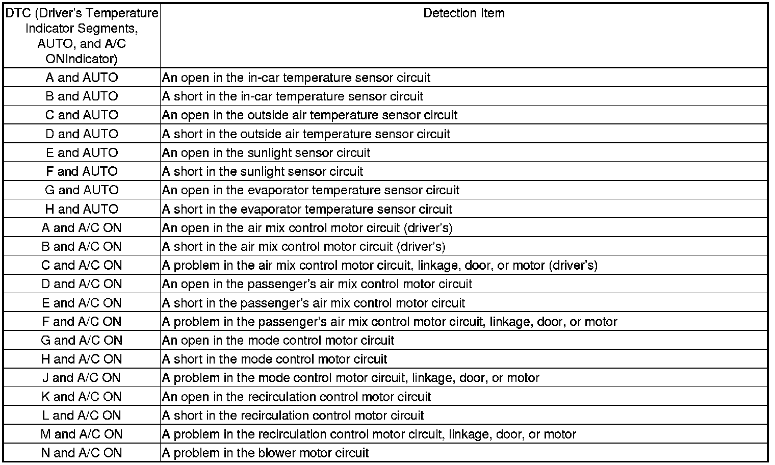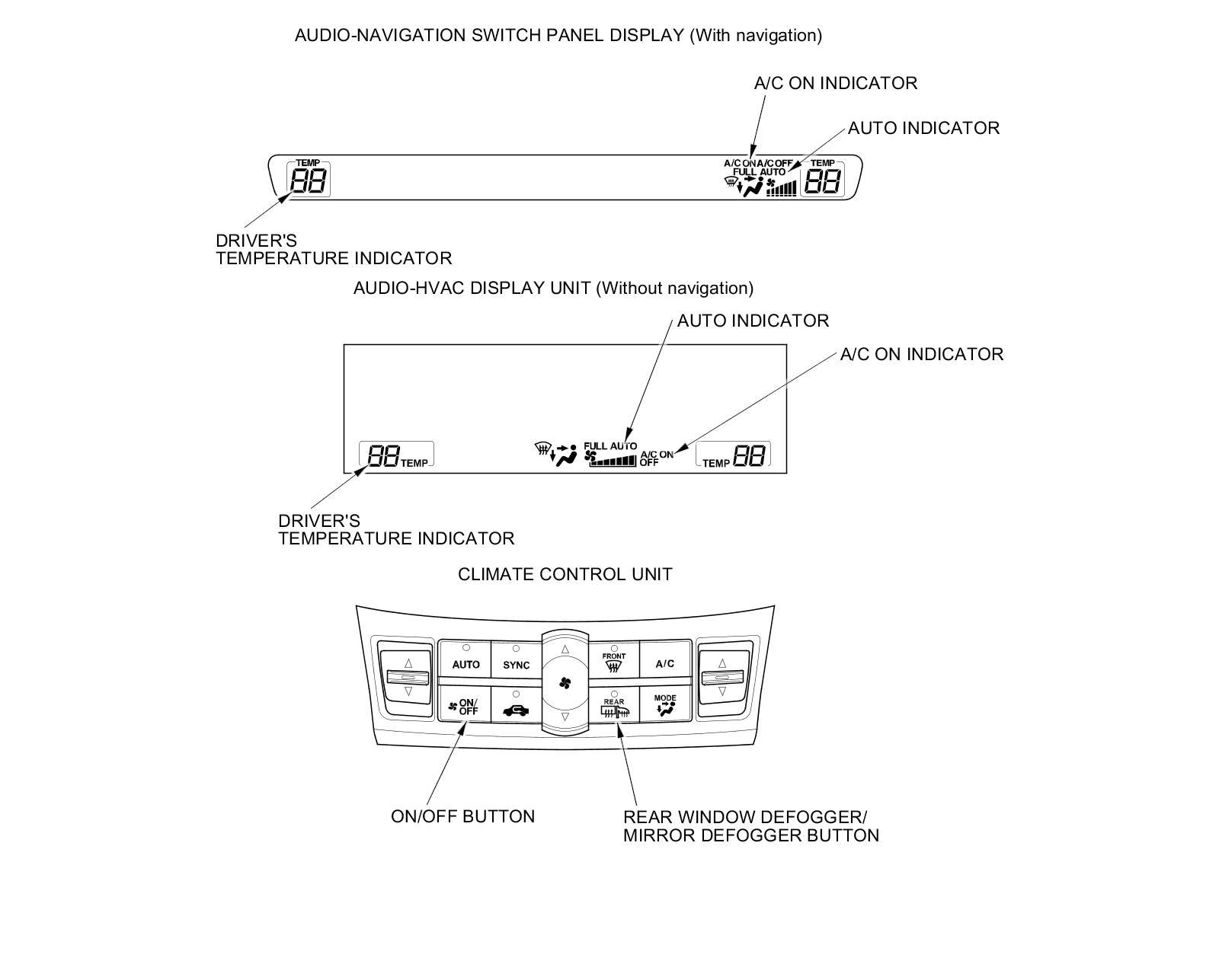 - If there is a problem with the system, it will flash 88 and AUTO, 88 and A/C ON, or 88 AUTO and 88 A/C ON, and one or more of the 13 indicator segments (A through N). Refer to checking for DTCs.