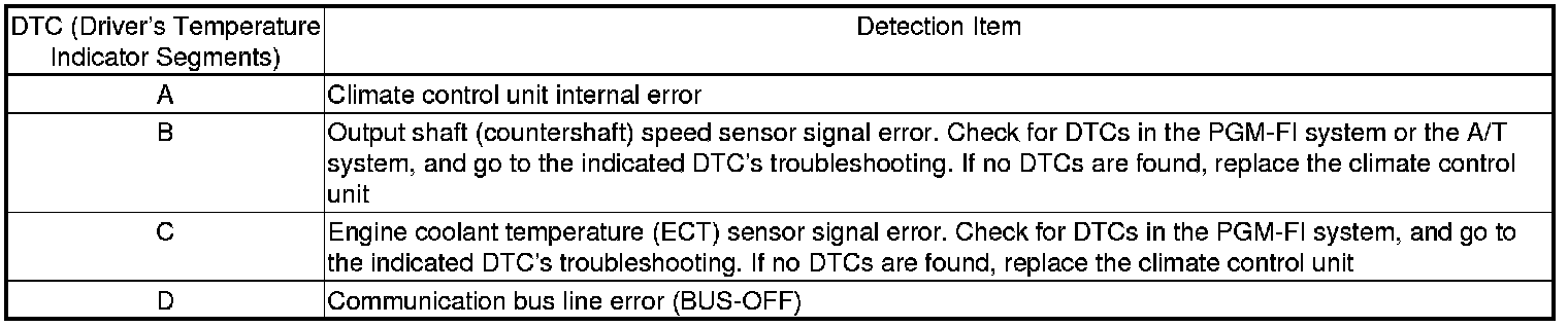NOTE: If the driver's temperature indicator segments A, C, D, E, G, K, with the AUTO indicator, or the A/C ON indicator are on at the same time, there may be an open in the common ground wire.