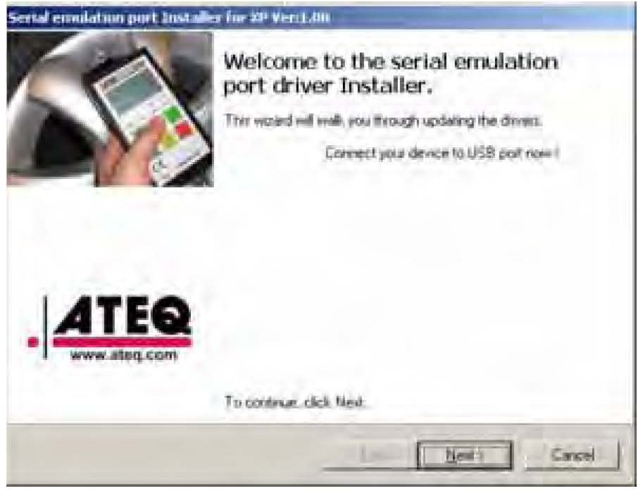 11. The serial emulation port driver installer screen appears. Connect your VT55, and turn it on. Select Next.