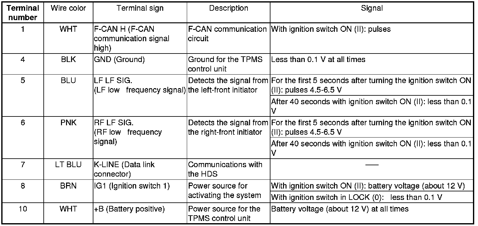 - When the ignition switch is turned to ON (II), the initiators send a LF (low frequency) band wave signal to the tire pressure sensors, switching them from sleep mode to normal function mode. When the ignition switch is turned to LOCK (0), the sensors switch from normal function mode back to sleep mode to extend their battery life.