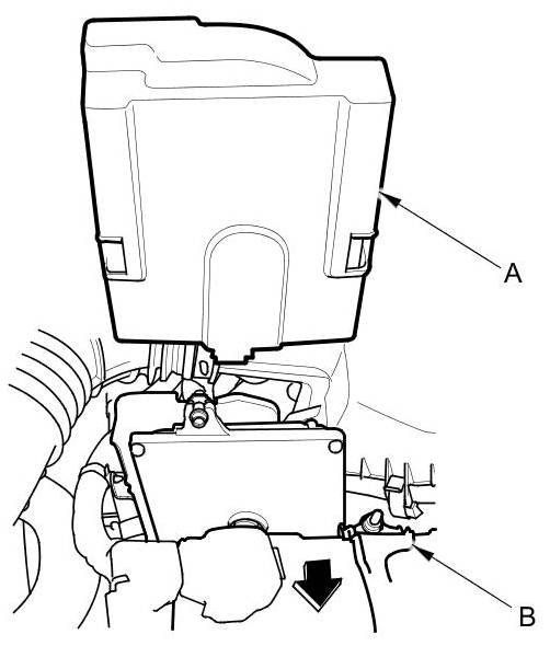 11. Remove the battery setting plate (B), and reposition the battery away from the ECM/PCM.