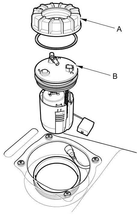 7. Remove the locknut (A) and the fuel tank unit (B).