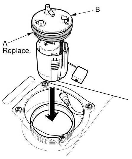 1. Temporarily attach a new base gasket (A) to the fuel tank unit (B), then insert the fuel tank unit partially into the fuel tank.