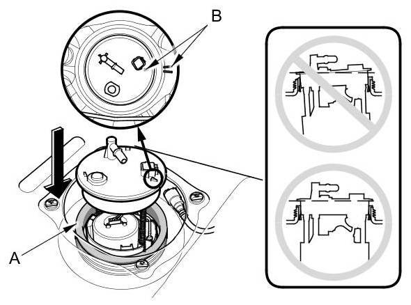 3. Align the marks (B) on the fuel tank and the fuel tank unit, then insert the fuel tank unit into the fuel tank until the fuel tank unit rests on top of the base gasket.