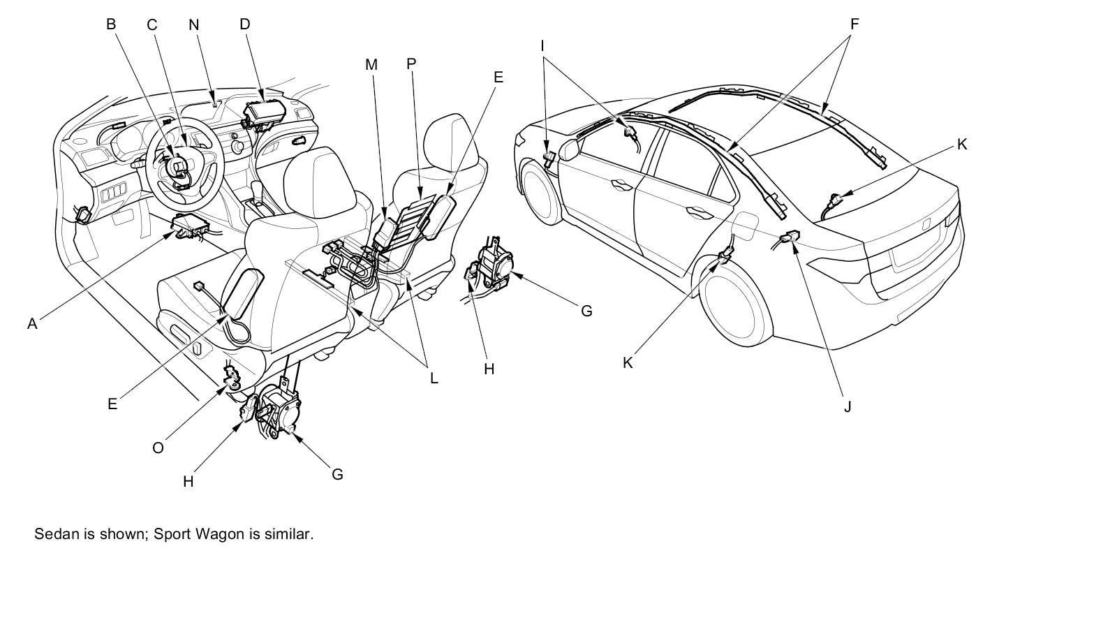 The SRS is a safety device which, when used with the front seat belts, is designed to help protect the driver and front passenger in a frontal impact exceeding a certain set limit. The system consists of the SRS unit (A) including safing sensor and impact sensor, the cable reel (B), the driver's airbag (C), the front passenger's airbag (D), the side airbags (E), the side curtain airbags (F), the front seat belt tensioners (G), the side impact sensors (first) (H), the front impact sensors (I), the rear safing sensor (J), and the side impact sensors (second) (K).